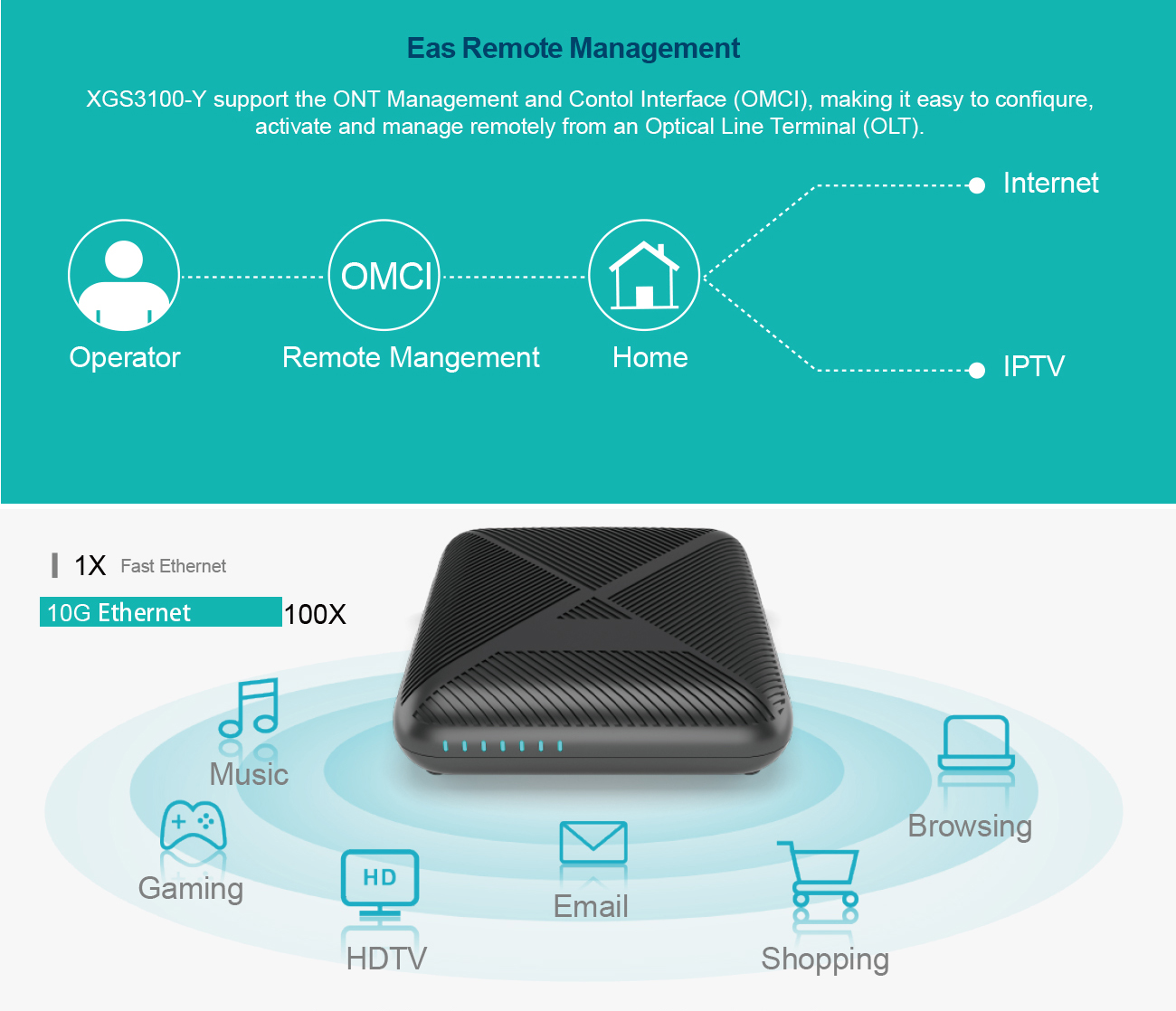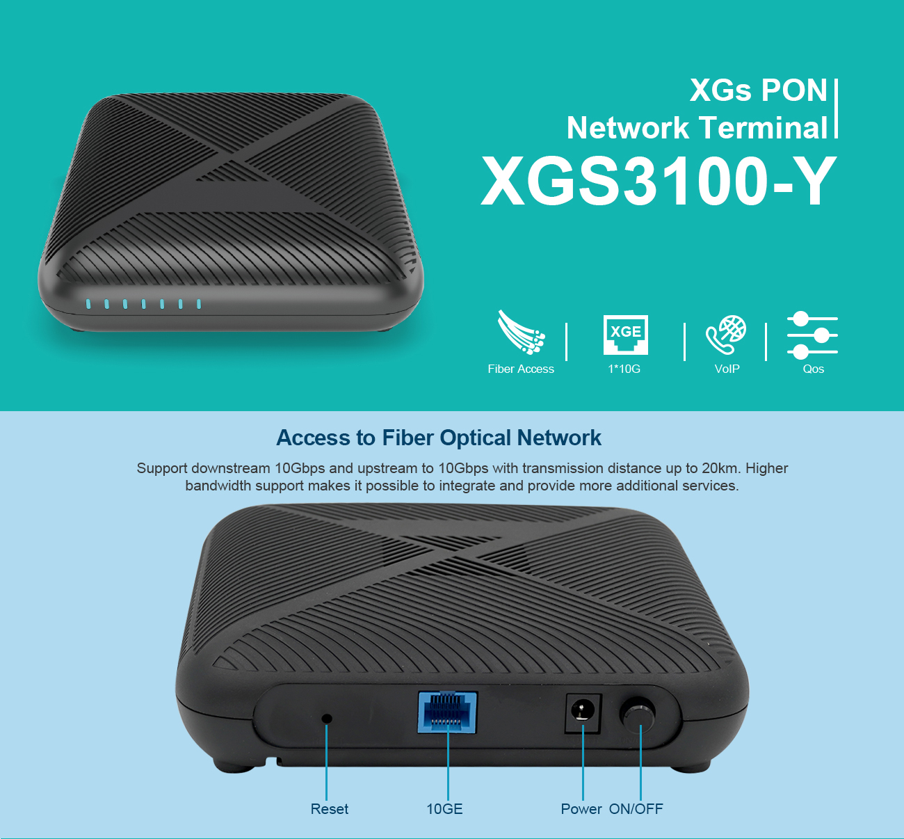 The XGS3100-Y next-generation XGSPON terminal is the perfect solution. With lightning quick 10Gbps symmetric transmission, it offers incredible bandwidth for high-speed downloads, seamless video streaming, lag-free online gaming, and crystal-clear VoIP calls. Robust quality of service controls and advanced security features ensure your network stays up and running smoothly. Plus with its extensive VLAN and multicast support, the XGS3100-Y easily handles any network configuration. Sleek, compact and rack-mountable, this powerful optical terminal brings carrier-grade fiber access right to your home or office. Get ahead with future-proof fiber speed - upgrade to the XGS3100-Y XGSPON terminal today!
